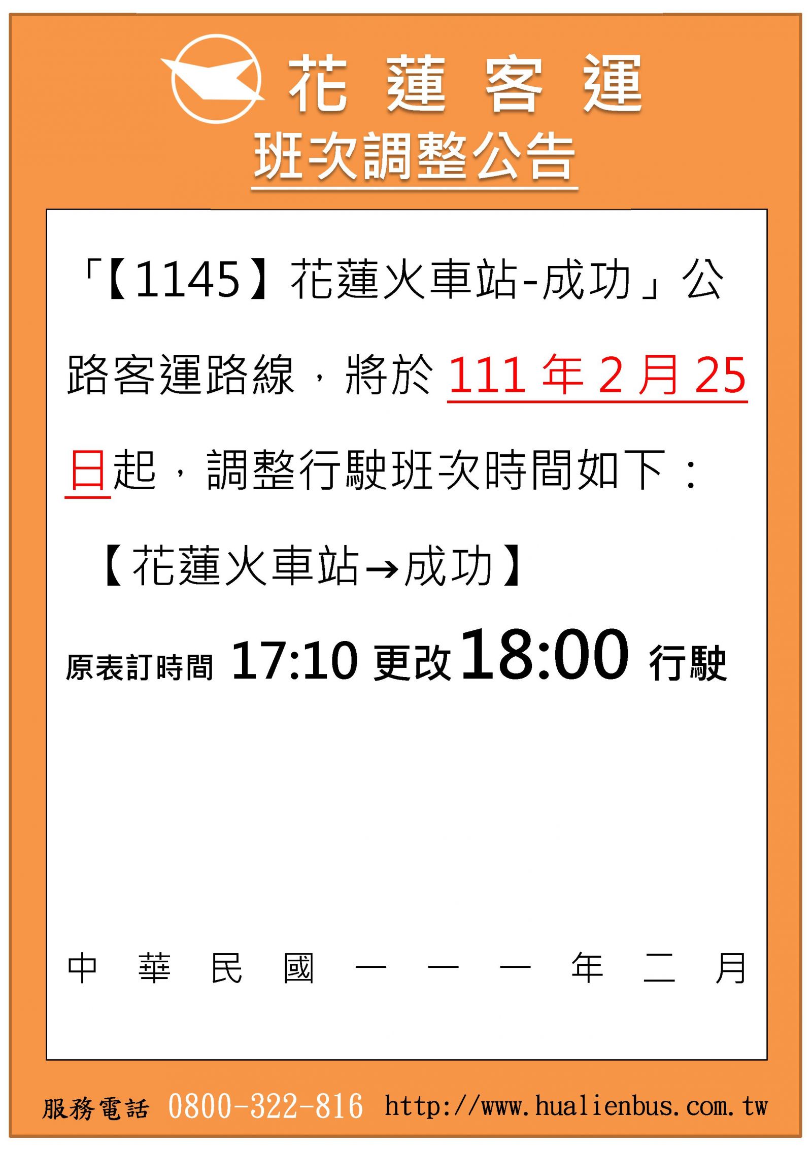 因民眾反應經由台11線之公路客運路線17時10分『1145花蓮火車站-成功』末班車發車後即無大眾運輸可搭乘返家,本公司業務考量及順應民行,經申請後於2月25起實施。